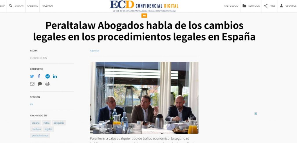 Los cambios legales en los procedimientos legales en España son abordados por Peraltalaw Abogados en el periódico ECD Confidencial Digital